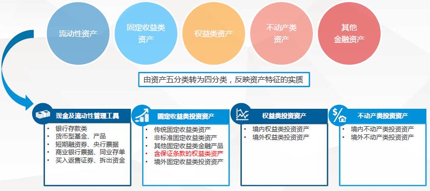 资产分类由原先五分类变为四分类,反映资产特征的实质。其中固定收益类投资资产分为五类。传统固定收益资产分为定期存款、协议存款、结构性存款、(准)政府债券、金融债券、企业(公司)债、中期票据、债券基金;非标准固定收益类资产指基础设施债权投资计划、固定收益类保险资管产品、不动产债权投资计划;含保证条款的权益类资产为优先股债务工具、有保证条款的股权投资计划、含保证条款的私募股权投资基金等;其他固定收益类金融产品包括商业银行理财产品、信贷资产支持证券、融资类信托计划、资产支持专项计划、项目资产支持计划等。