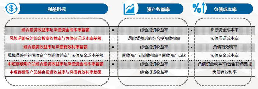 收益率指标包括会计投资收益率和综合投资收益率。未来季度稳定的现金流入,如固收类资产的到期收入、权益类资产确定发放的分红、房地产的房租收入等会纳入在年化投资率的计算中。负债成本率包括负债资金成本率和负债保证成本率。通过账户资产规模和未来负债支出计算出的负债有效利率(IRR),可以一定程度反映出公司包括死差、利差、费差在内的整体情况。中短存续期产品在计算有效利率时,如不能拆分对应投资资产,应使用法定准备金替换账户帐面价值进行计算。