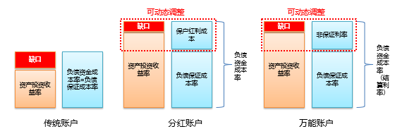 传统账户的负债资金成本与保证成本一致,一般为2%或2.5%,费改后不超过3.5%。右边是负债保证成本率,左边为资产收益率,此处会出现缺口。对于分红账户来说,负债资金成本包含保证利率与非保证利率(保户红利),将其与资产投资收益率进行比较,负债资金成本率中的?;Ш炖杀居晒咀孕行婢龆ǎ虼烁貌糠至粲幸欢占?,可以动态调整、核心管控。对于万能账户,其负债资金成本包括保证利率和非保证利率,这两者也即万能账户的结算利率。同样道理,结算利率的非保证利率部分也可以进行动态调整。