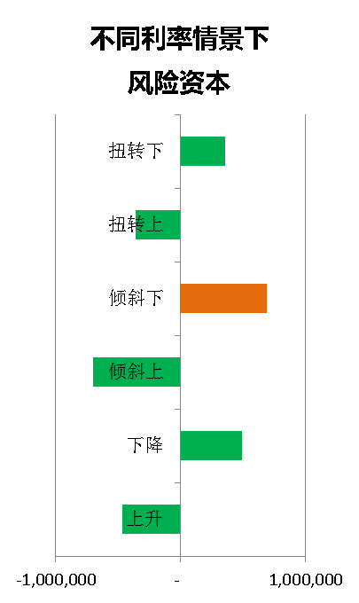 该示例展示了六个情景下风险资本的情况。六个情景中最不利的情景是利率先上升后下降的情况。结合倾斜下的久期缺口可知,在前10年由于缺口为正,资产不敏感,此时利率上升是不利的情景。10年之后是负缺口,负债更为敏感。此时利率下行同样是不利的。因此在倾斜下的场景中,前期利率上升,后期下降的情况产生的风险资本是最高的甚至高于利率持续下降的情景。