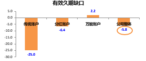 由图可见,传统账户有较大的久期缺口,分红账户缺口较小,万能账户久期为正值。公司整体综合指数是-5.8,将该数值应用在公司总体的利率风险下,若公司总资产为一千亿,则利率上升一个点,公司的资本增值58个亿;下降一个点,资本消耗58个亿。