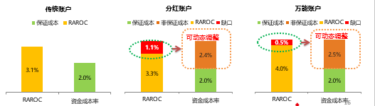 对于传统账户来说,RAROC计算之后要扣除3.1%的动态调整;分红账户的收益经过风险调整之后是3.3%,不足以覆盖成本缺口,此时就要考虑是否动态调整分红利率;万能账户需要做出1%的风险调整,它的RAROC是4.0%,也不足以覆盖成本率,在此情况下,需要采取动态调整非保证负债的措施。