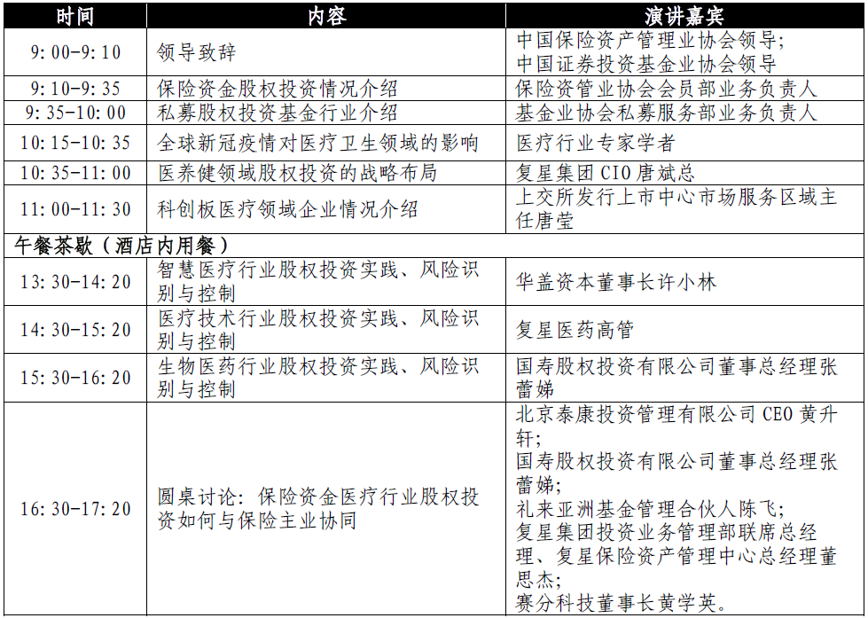 为增进保险资产管理机构对医疗健康行业不同细分领域的认识和理解,借鉴大型机构资金医疗健康私募股权投资经验,中国保险资产管理业协会(以下简称“协会”)联合中国证券投资基金业协会(以下简称“基金业协会”)将于2021年6月组织召开“2021年保险资金创新医疗领域股权投资研讨会”,本次研讨会将由复星集团承办。现就有关事项通知如下: