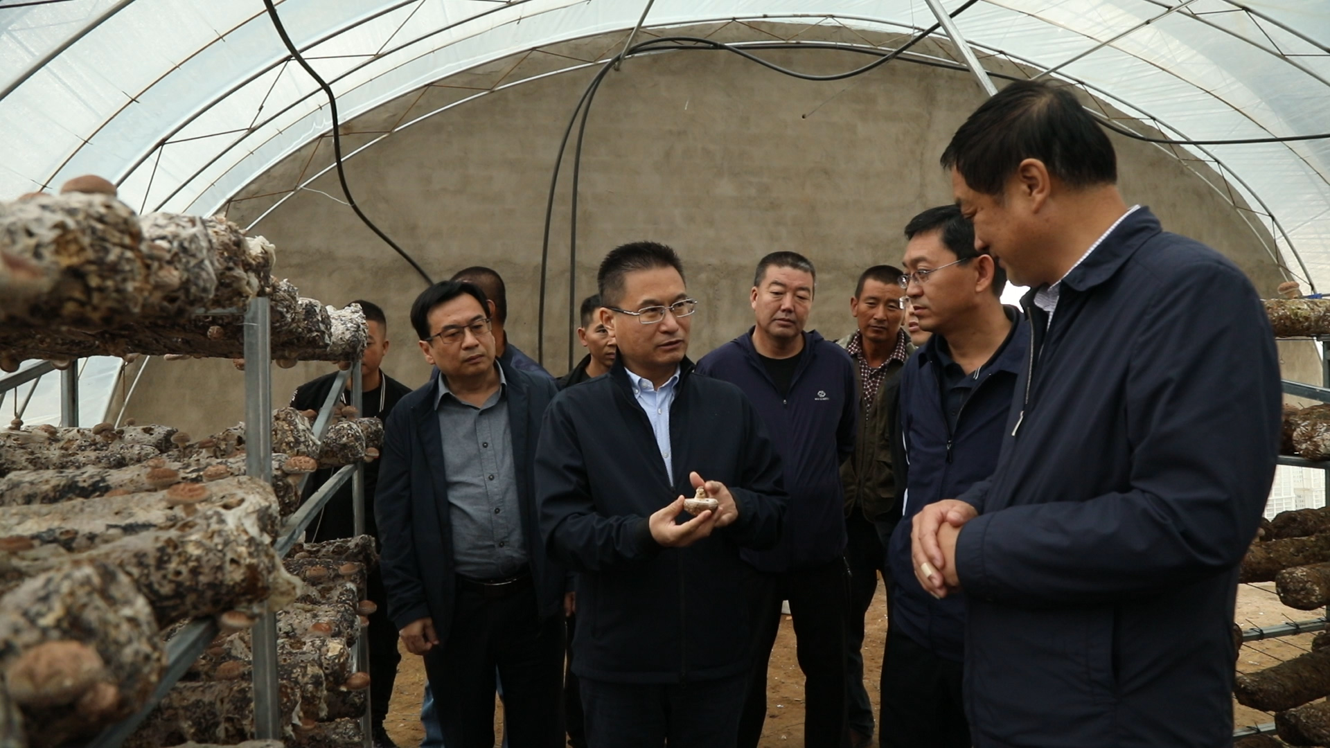 抵达苏木后,调研组一行首先来到中国保险资产管理业产业扶贫基地——哈必力格嘎查集体经济平地脑包浩特蘑菇大棚项目(以下简称“蘑菇产业项目”),与旗委书记纪全富,旗委常委、政府副旗长倪龙及苏木和旗扶贫办主要领导同产业技术带头人就发菌育菇技术、产品市场收益、产业发展前景和贫困户带动效应等方面进行详细了解和深入探讨,并为参与支持蘑菇产业项目第二期建设的6家保险资管机构揭牌。