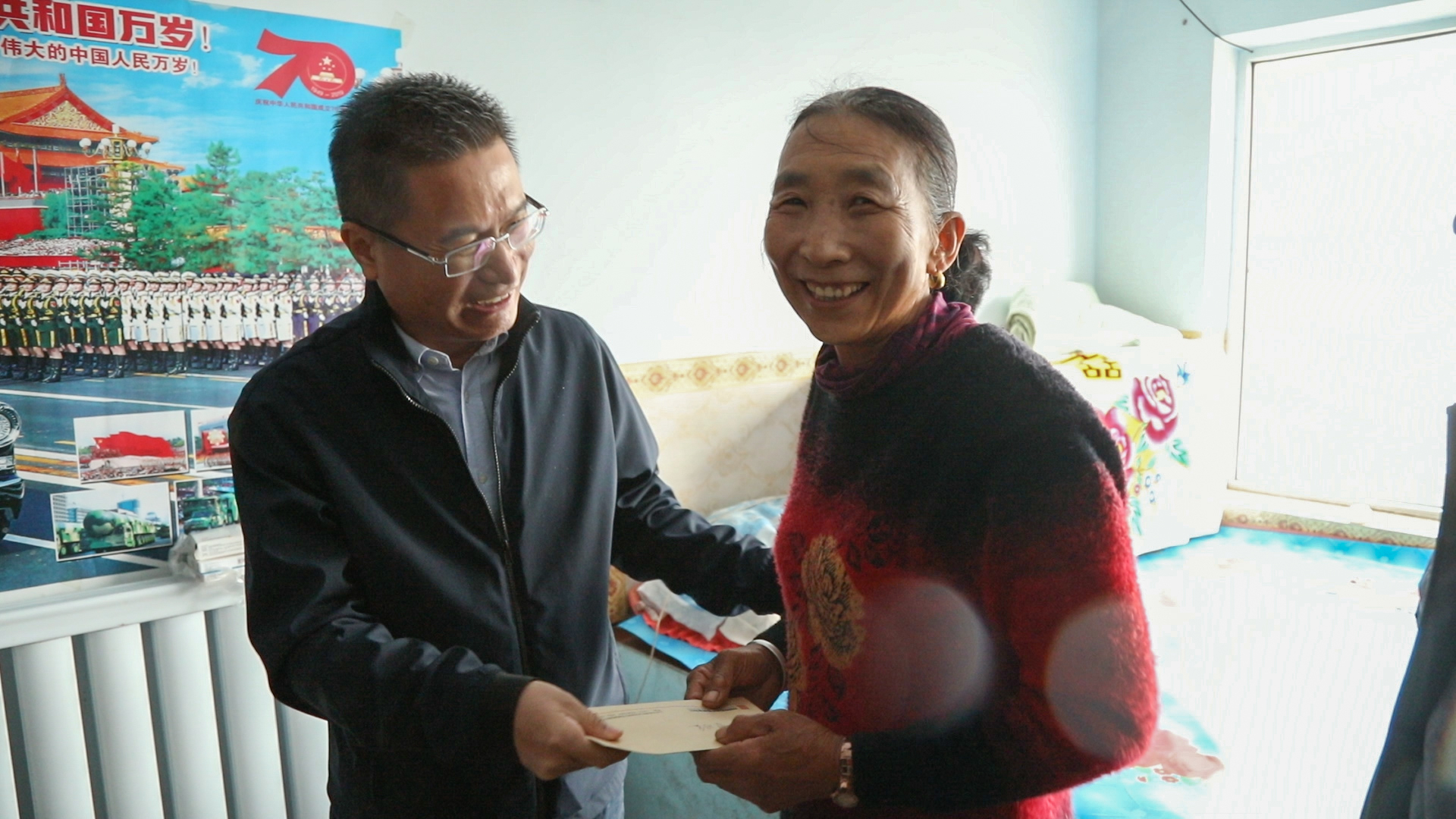 随后,调研组一行还来到哈必力格嘎查贫困户黄万顺家中探望,详细询问黄万顺夫妇的身体状况和生产生活情况,送上慰问金和粮油等生活用品,并鼓励他们坚定信心,克服困难,以积极的心态创造更加幸福美好的生活。