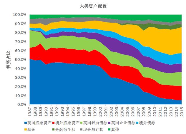 从80年代末到2000年之前,英国保险公司还有养老金这些机构投资者的大类资产配置基本是40%的债券、60%的股权,或者是各50%。传统的资产配置大概从2000年之后发生了结构性转变,最为明显的有四点,一是权益类投资占比大幅度下降,二是固收类占比大幅度增加,尤其是公司债还有其他类型信用债比例增加非常明显,三是另类投资占比也逐渐变高,我们看到黄色部分是基金配置的占比,基金有相当的一部分是另类投资,四是海外投资占比在逐渐增加。这样的趋势都是因为保险公司通过资产负债匹配,分散资产风险,从而达到更好的资本运用效率。