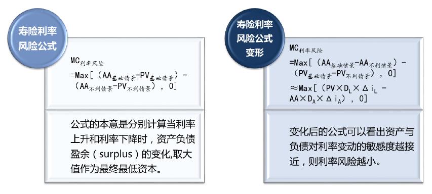 我们知道,寿险公司利率风险的最低资本计量使用情景法,上面已经介绍过它的计算规则。现在我们对这个公式进行一个变形,从左边的公式变为右边的公式,公式的释义就变为资产在不同利率情境下的变化减掉负债在不同利率情境下的变化,并对这两个差值取最大值。这里我们很容易联想到,资产在不同利率情景下的变化其实可以用久期的方法来反映,这个变化如果不是特别大的话,约等于负债乘以久期再乘以ΔiL利率变化减掉资产乘以久期再乘以ΔiA利率变化。如果PV和AA规模相当的话,只要DL(负债久期)和DA(资产久期)相对接近,那么公司的利率风险就会降到最低。这里要注意的是我们需要关注它的规模,所以AA乘以DA就是金额久期,这说明是和规模有关系的。此外,资产负债的利率曲线,保监会给了两条线,它们本身是不一致的,同时基础情景和不利情景的线性变化过程也不是平移的过程。如果我们要把这部分做的细致深入的话,需要考虑的是关键久期的变化,才能把这条线模拟得最契合它的要求。