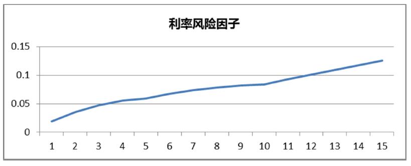 下面介绍一下期限结构对于利率风险最低资本的整体影响。在利率风险的计算过程中,产险公司是采用因子法,风险因子直接和利率挂钩。下面这张图就是产险的最低资本,横轴是久期,纵轴就是最低资本的风险因子。我们可以看到,久期越长,风险因子占比越高。财产险的负债久期短,流动性要求高的特点,偿二代下利率风险因子的安排,也体现了不鼓励短期的负债资金用于长期投资。