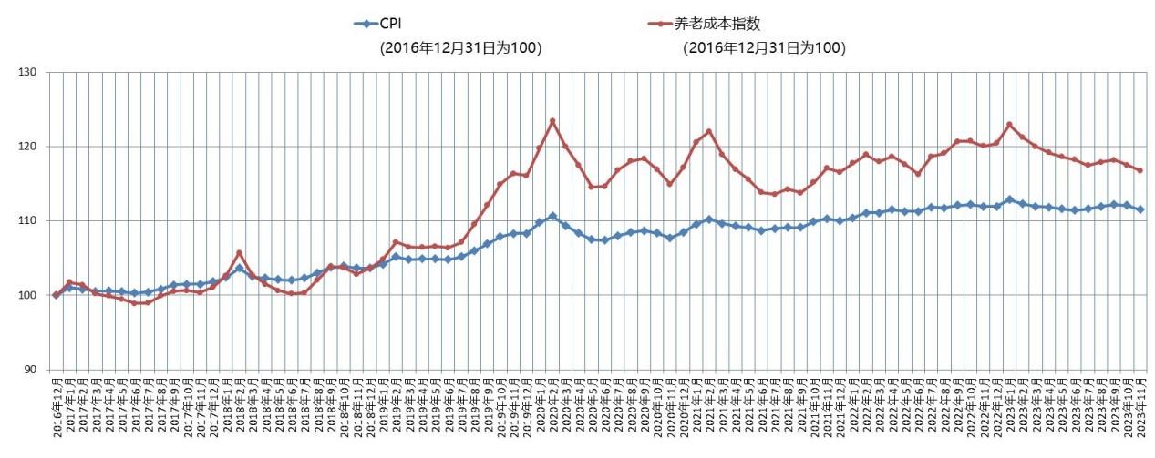 (图一):2016年底至2023年11月CPI及养老成本指数走势图