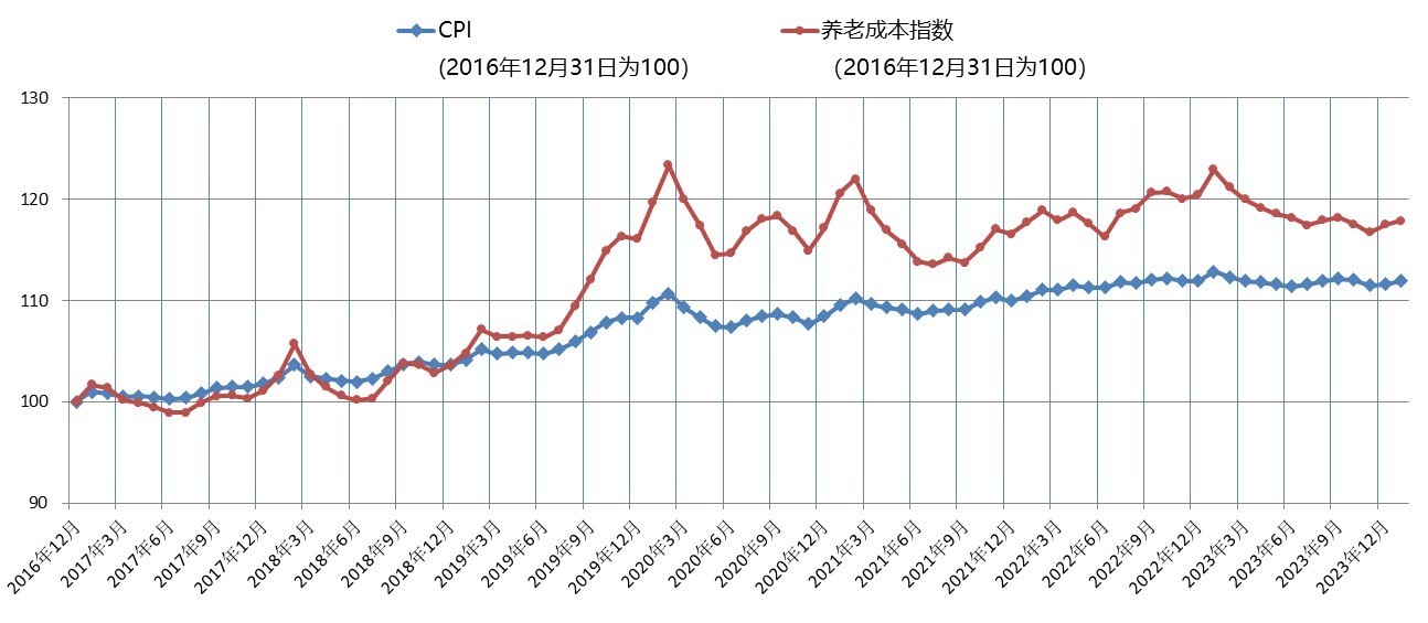 (图一):2016年底至2024年1月CPI及养老成本指数走势图
