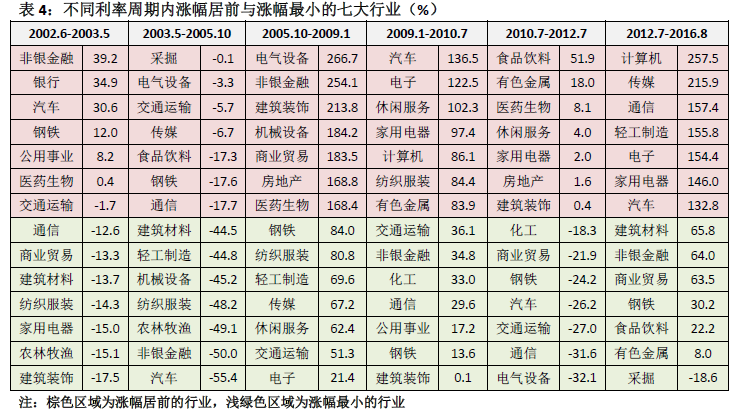 另一方面,由于利率周期与经济周期较为同步,利率周期变化能够反映经济的周期性变化,因此,基于利率周期观察行业变化具有实际意义。从行业角度看,各行业涨幅的差异也与经济转型的大趋势相吻合。涨幅居前的行业主要包括了电气设备、计算机、传媒等新兴领域,也包括医药生物、家电、汽车等消费驱动型行业。市场走势整体上与经济转型下,新兴产业的快速发展以及经济增长方式转变下,消费升级驱动相一致。与此同时,钢铁、交通运输、采掘以及化工、纺织服装、有色金属等涨幅相对落后的行业,普遍为周期性行业,受产能过剩、经济转型等因素的共同影响,纺织服装行业作为我国出口占比第一位的行业,近年来随着劳动力成本的持续上升,出现了产业向境外转移的趋势。因此,从长期看,股票市场行业走势的分化与经济发展特征相一致。
