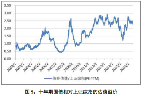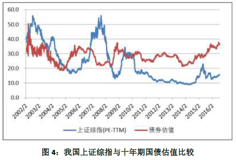 从股票市场与债券市场的估值对比看,在2010年之前,整体估值较为接近,而在2011年以来,债券市场估值上升,债券市场整体估值相对上证综指维持在2.5倍左右,表明经济下行压力下,市场利率的持续回落推升了债券市场整体估值。目前,十年期国债估值是上证综指估值的2.3倍,处于相对高位,但是在经济下行压力下,流动性宽松延续,仍然存在债券收益率进一步下降的情形,而风险偏好将成为影响股票市场走势的关键因素。