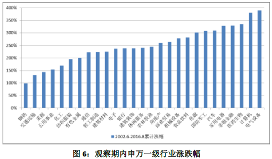 在2002年6月至2016年8月期间,虽然债券市场经历了长短不同的周期性变化,但整体而言,十年期国债收益率变化幅度并不大,相比之下,股票市场的走势却出现显著的分化。一方面,股票市场整体上与经济增长相契合,自2002年以来,虽然我国经济经历了不同的增速变化,但整体上仍保持了中高速增长,尤其是在2002年至2011年期间,平均增速达到了10.37%。与此相对应,股票市场虽然也存在着牛熊演绎,但整体上也呈现上涨走势,申万一级行业平均涨幅为249.22%。