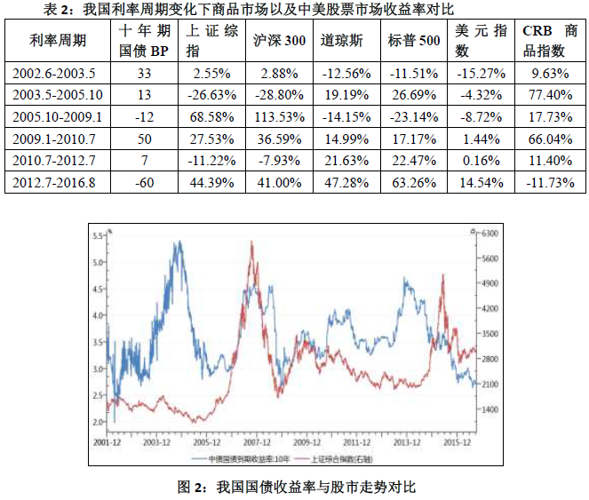 首先,各资本市场收益特征与利率周期变化的关系表明,我国股票市场受流动性以及基本面因素影响较大,而商品市场的顺周期性特征更为明显一些,与中国市场相比,美国股票市场与经济走势之间的相关性较高。