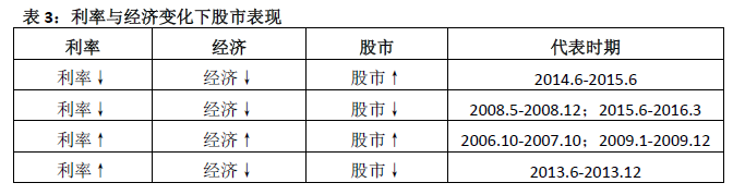 资本市场走势与利率周期性变化存在密切关系,利率走势与资本市场的联动关系存在两条路径。一条路径是,利率周期变化反应了市场流动性的变化格局,而流动性是资本市场走势的重要影响因素。例如2004年我国十年期国债收益率出现一轮明显的趋势性上涨走势,表明市场流动性处于相对紧张的状态,受此影响,股市整体震荡下跌,同样在2013年下半年的“钱荒”阶段,国债收益率快速上涨与股市的持续下跌同时出现,二者呈现出明显的负相关特征。另一条路径,是经济层面的传到路径。利率周期与经济周期趋于同步,而经济因素也是影响资本市场走势的重要因素,即使是国债收益率出现持续上涨,但受到经济基本面推动,股市仍出现大幅上涨,如2006至2007年的一轮牛市,以及2009年四万亿经济刺激政策推动下的经济反弹阶段。